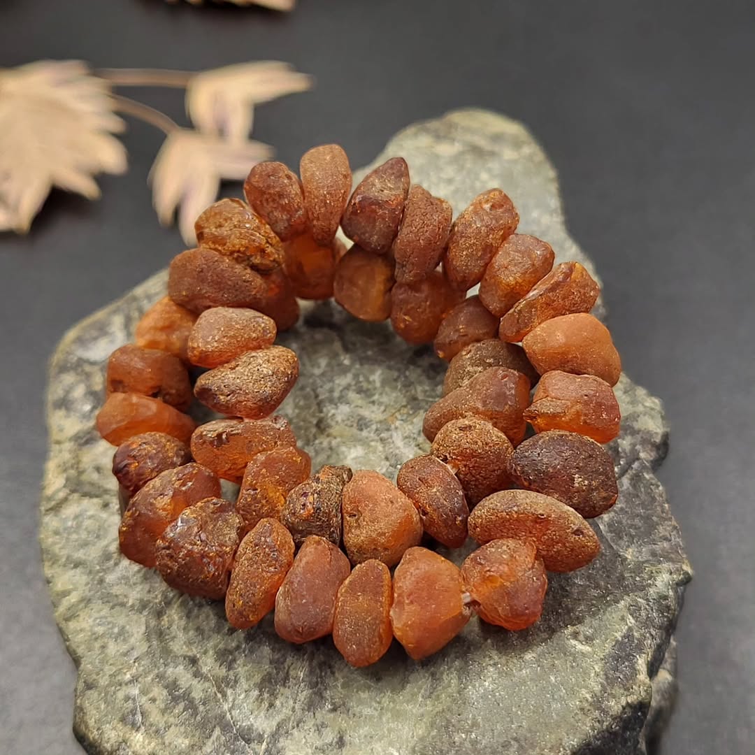 Dieses wunderschöne Armband besteht aus rohen, unbehandelten Bernsteinperlen in warmen, erdigen Tönen von Honig und Cognac. Jede Perle ist ein einzigartiges, unpoliertes Nugget, das die natürliche Textur und Schönheit von echtem baltischem Bernstein zur Geltung bringt. Die rustikale, unberührte Oberfläche des Bernsteins verleiht dem Armband ein einzigartiges, organisches Gefühl, perfekt für alle, die natürliche Schönheit und schlichte Eleganz schätzen.